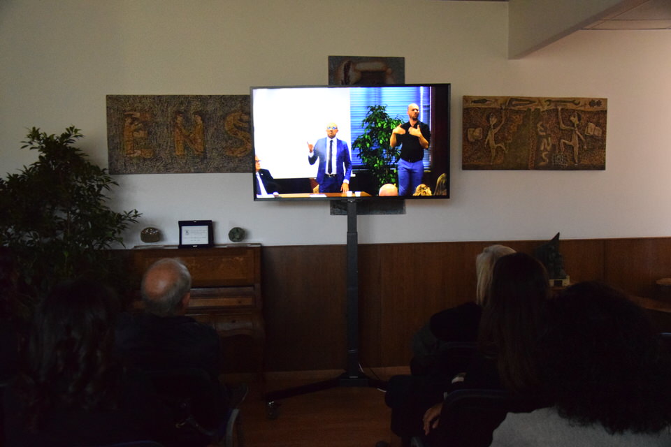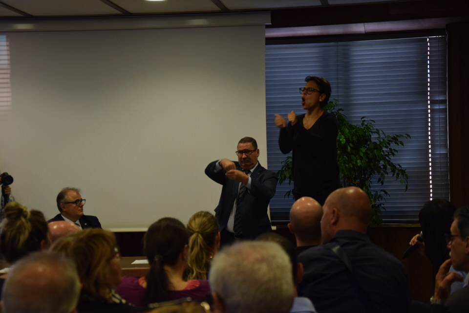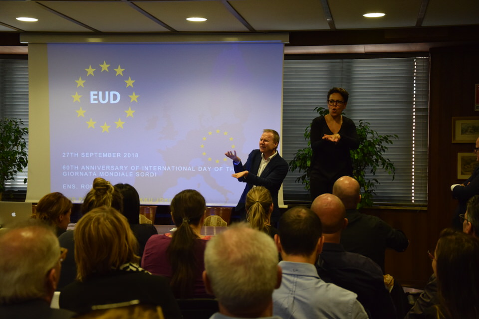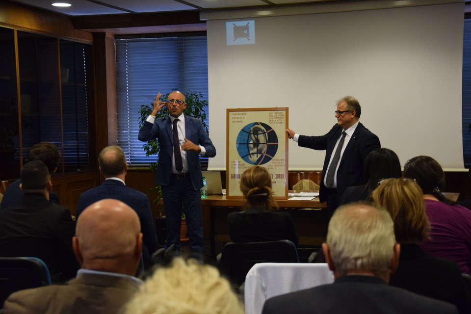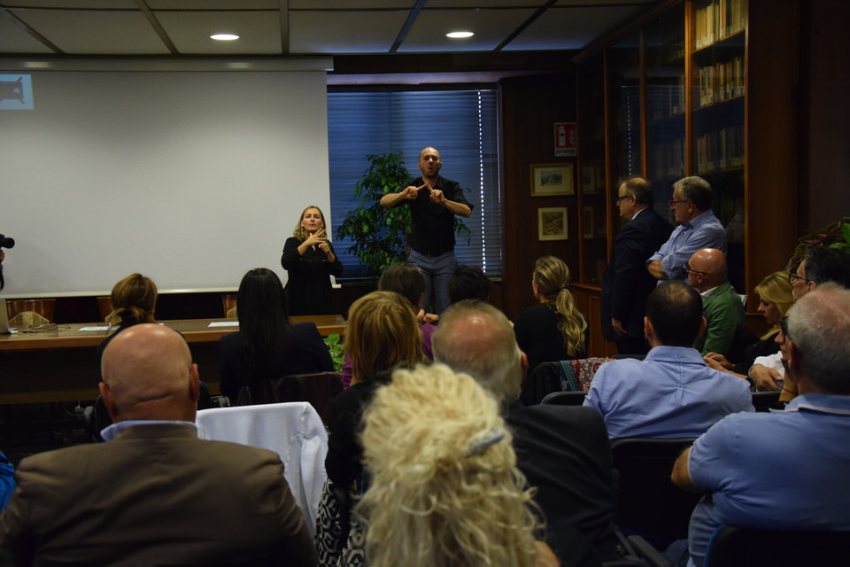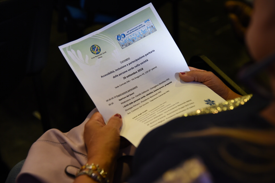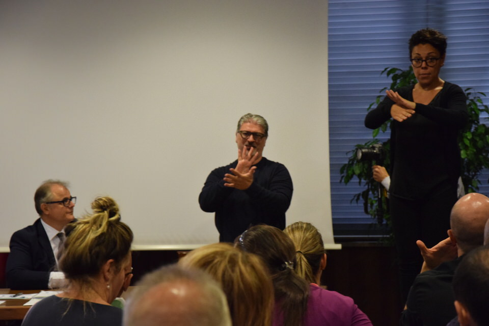 Questa mattina è stata anche la volta del Convegno “Accessibilità, inclusione e partecipazione paritaria delle persone sorde nella società”. Dalle 9 alle 13 sono stati tanti i relatori e gli ospiti - moderati dal Consigliere Direttivo Camillo Galluccio - che hanno preso parola in Sala Ieralla e hanno regalato con i loro interventi una panoramica estremamente esaustiva sulla situazione delle persone sorde in Italia e nel mondo. Dopo i saluti del Presidente ENS Giuseppe Petrucci e del Segretario Generale Costanzo Del Vecchio, infatti, sono intervenuti i rappresentanti delle principali Associazioni Internazionali dei Sordi e di alcune Associazioni Nazionali. In ordine di intervento citiamo Markku Jokinen Presidente dell'European Union of the Deaf, Florjan Rojba Membro del Board della World Federation of the Deaf, Humberto Insolera Membro Esecutivo dell'European Disability Forum, Annika De Maeyer dell'Associazione Sordi Svizzera e Steven Mulvaney dell'Associazione Sordi Malta. A tracciare la situazione odierna della comunità sorda, dell'ENS e della sua storia e della Lingua dei Segni Italiana, ci hanno pensato con i loro interventi Sergio Cao Consigliere Direttivo ENS, Sebastiano Manciagli, Susanna Ricci Bitti Vice Presidente del CGSI, Rosella Ottolini Consigliera ENS Milano, Mita Graziano e Anastasia Lekontseva e Olga Capirci dell'Isituto di Scienze e Tecnologie della Cognizione del CNR. "Le ricerche in tutto il mondo - ha esposto la dott.ssa Capirci - ci dicono che le lingue dei segni non sono un ostacolo, ma anzi favoriscono l’apprendimento delle lingue vocali. L’esposizione alle lingue dei segni porta addirittura a dei vantaggi cognitivi a bambini sordi e udenti.”