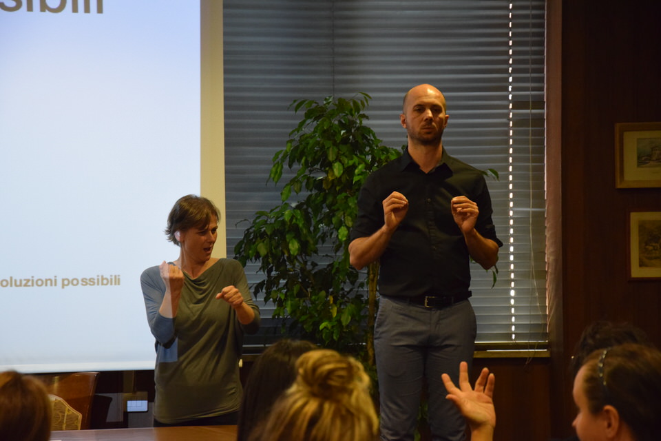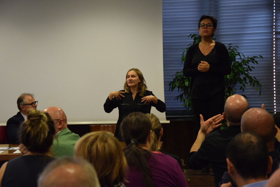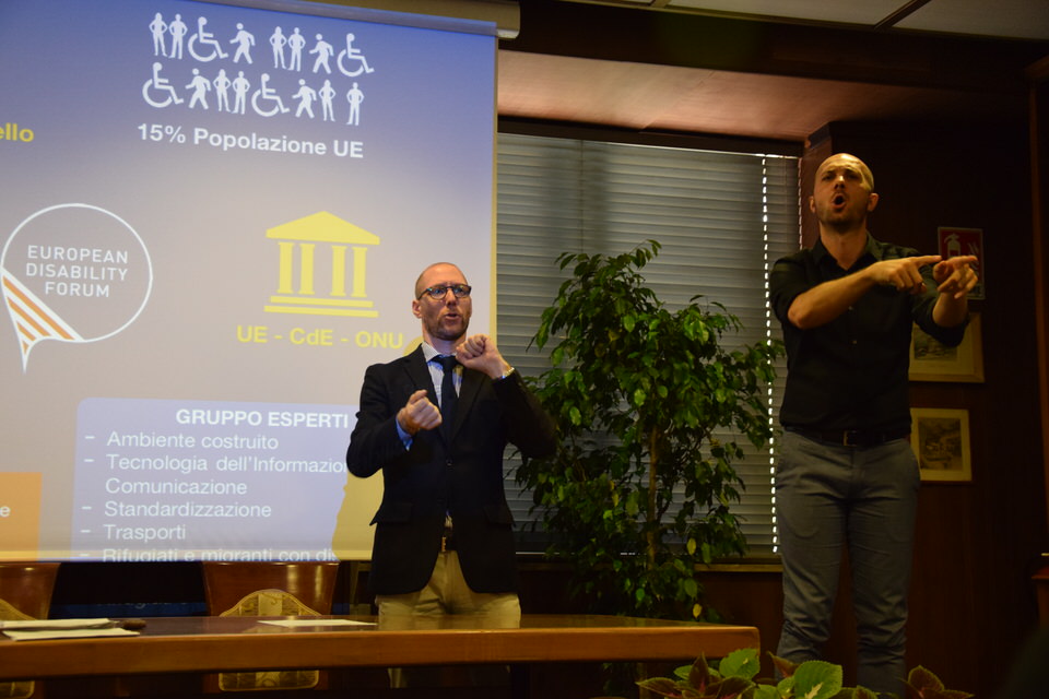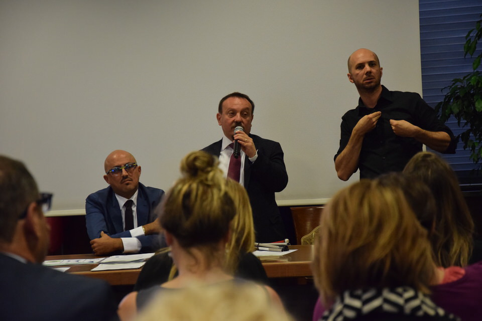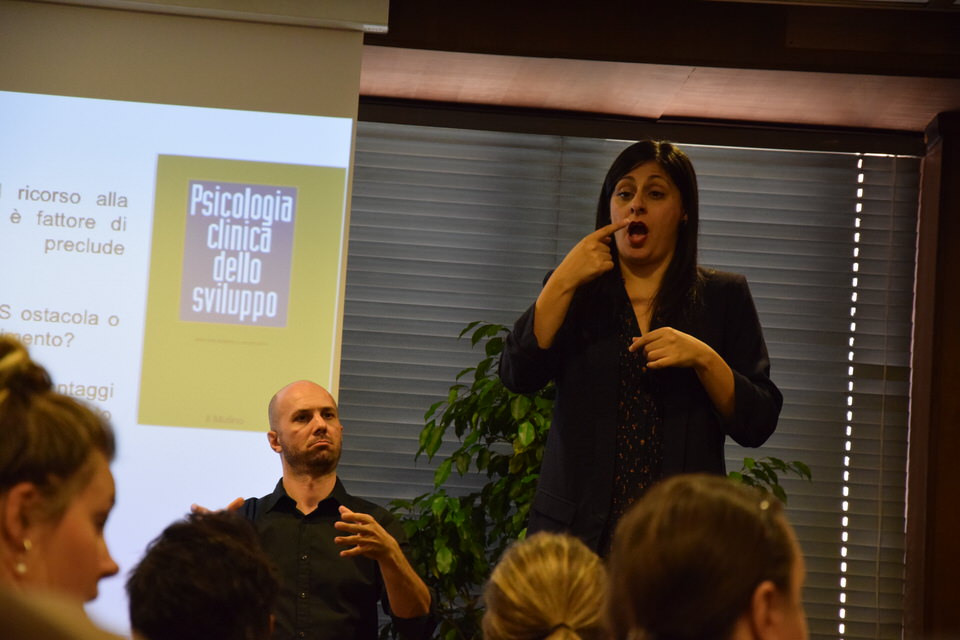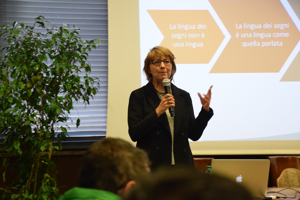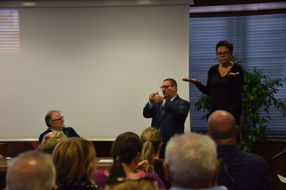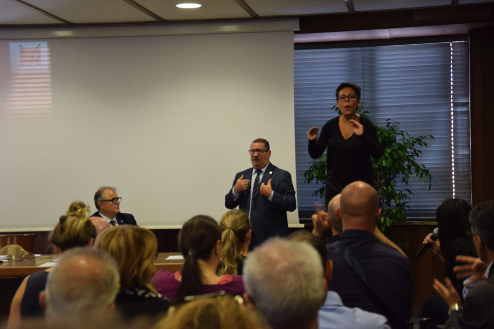 Questa mattina è stata anche la volta del Convegno “Accessibilità, inclusione e partecipazione paritaria delle persone sorde nella società”. Dalle 9 alle 13 sono stati tanti i relatori e gli ospiti - moderati dal Consigliere Direttivo Camillo Galluccio - che hanno preso parola in Sala Ieralla e hanno regalato con i loro interventi una panoramica estremamente esaustiva sulla situazione delle persone sorde in Italia e nel mondo. Dopo i saluti del Presidente ENS Giuseppe Petrucci e del Segretario Generale Costanzo Del Vecchio, infatti, sono intervenuti i rappresentanti delle principali Associazioni Internazionali dei Sordi e di alcune Associazioni Nazionali. In ordine di intervento citiamo Markku Jokinen Presidente dell'European Union of the Deaf, Florjan Rojba Membro del Board della World Federation of the Deaf, Humberto Insolera Membro Esecutivo dell'European Disability Forum, Annika De Maeyer dell'Associazione Sordi Svizzera e Steven Mulvaney dell'Associazione Sordi Malta. A tracciare la situazione odierna della comunità sorda, dell'ENS e della sua storia e della Lingua dei Segni Italiana, ci hanno pensato con i loro interventi Sergio Cao Consigliere Direttivo ENS, Sebastiano Manciagli, Susanna Ricci Bitti Vice Presidente del CGSI, Rosella Ottolini Consigliera ENS Milano, Mita Graziano e Anastasia Lekontseva e Olga Capirci dell'Isituto di Scienze e Tecnologie della Cognizione del CNR. "Le ricerche in tutto il mondo - ha esposto la dott.ssa Capirci - ci dicono che le lingue dei segni non sono un ostacolo, ma anzi favoriscono l’apprendimento delle lingue vocali. L’esposizione alle lingue dei segni porta addirittura a dei vantaggi cognitivi a bambini sordi e udenti.”