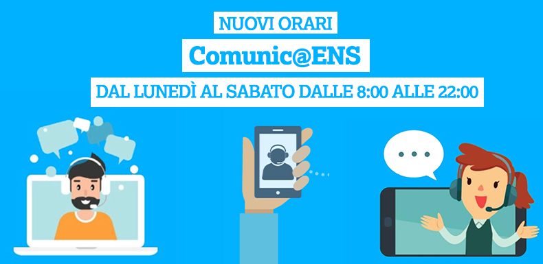 Siamo felici di informare tutta la comunità sorda che il Comunic@ENS, la prima piattaforma di comunicazione per le persone sorde in Italia, amplia le sue fasce orarie. Dal 9 maggio le persone sorde potranno usufruire del servizio dal lunedì al sabato DALLE ORE 8:00 ALLE ORE 22:00 (tutti i giorni ad eccezione delle domeniche e degli altri festivi). L'implementazione del servizio è stata possibile grazie al grande lavoro degli ultimi mesi della Sede Centrale ENS e dal recente inserimento di nuovi operatori.